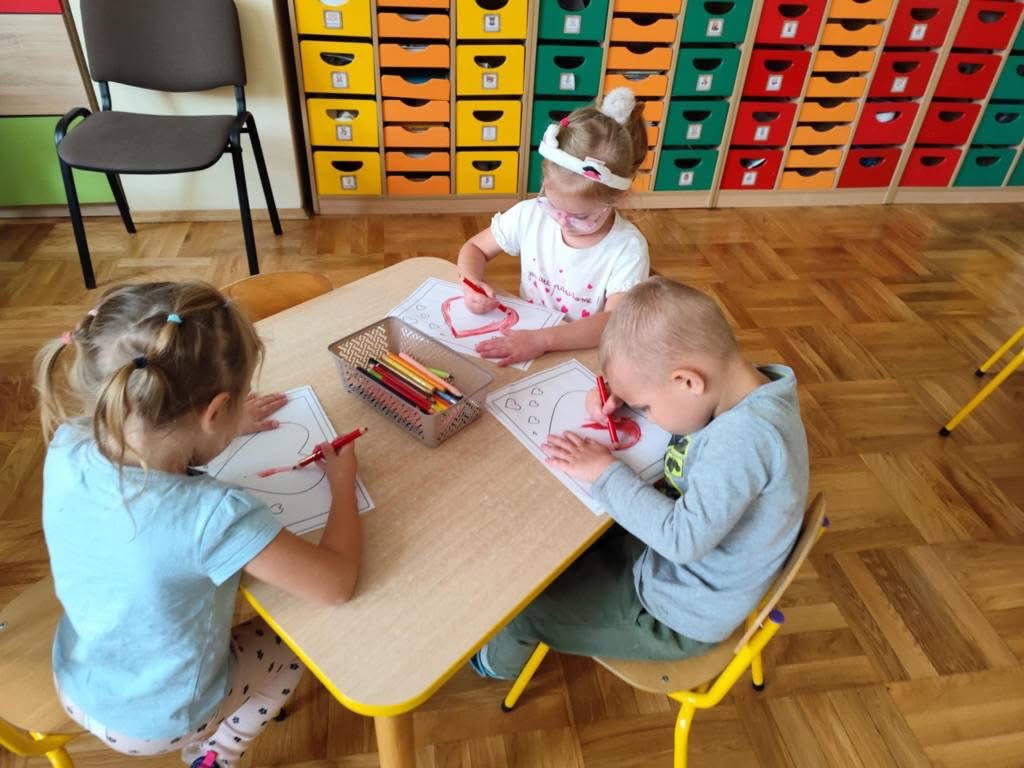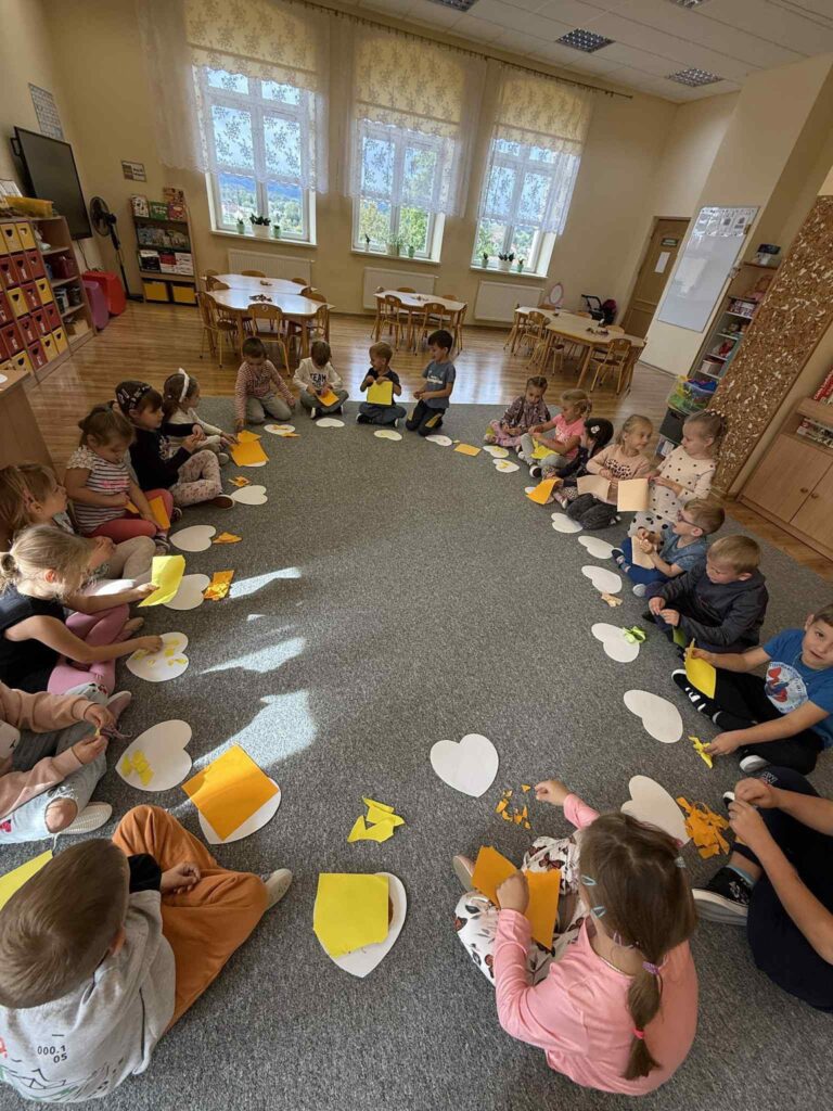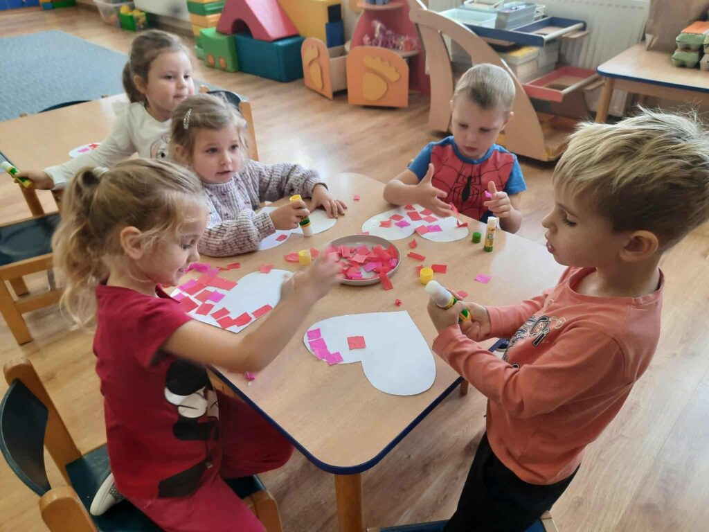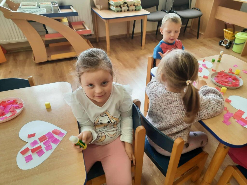 W ramach zajęć plastycznych dzieci wykonały piękne prace w kształcie serc, które ozdobiły przedszkole i stały się symbolem wspólnoty.